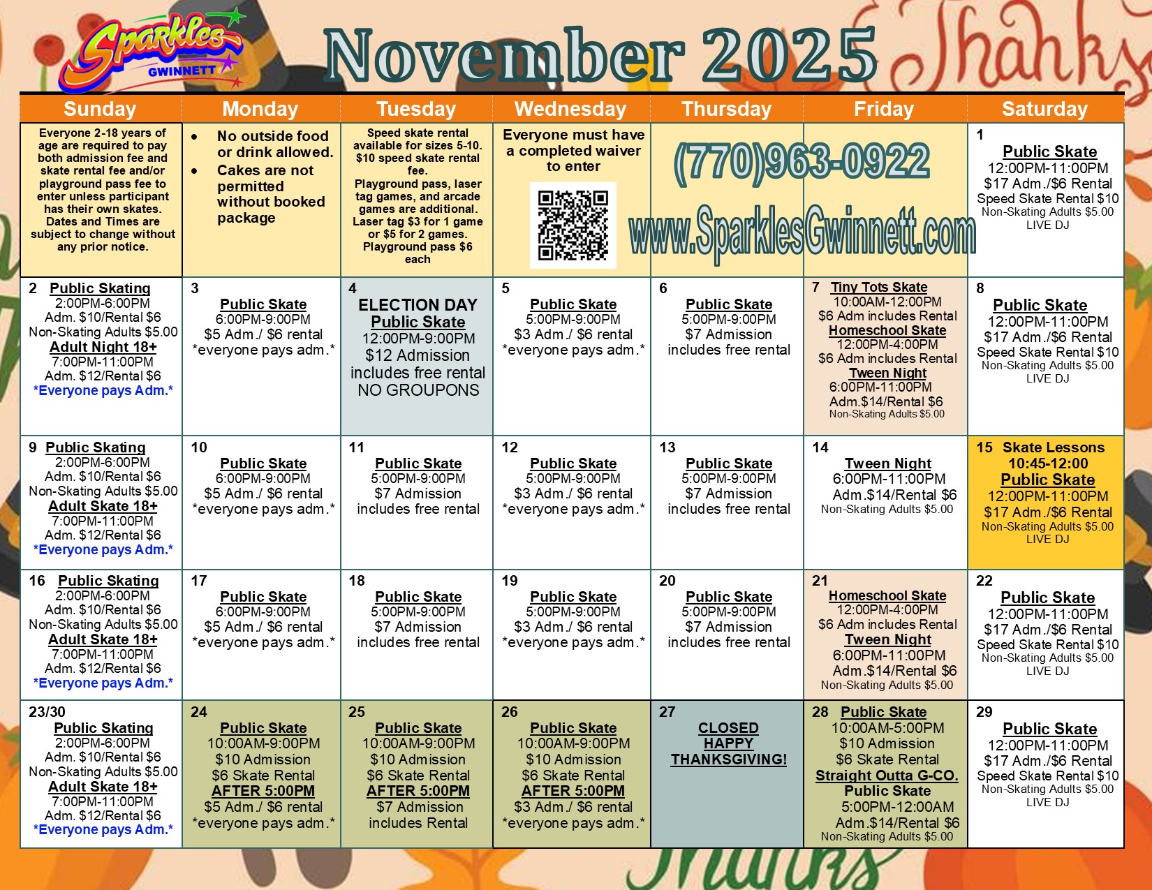 Skating times & prices are subject to change without prior notice. No outside food or beverages. Cake not permitted without a booked package.