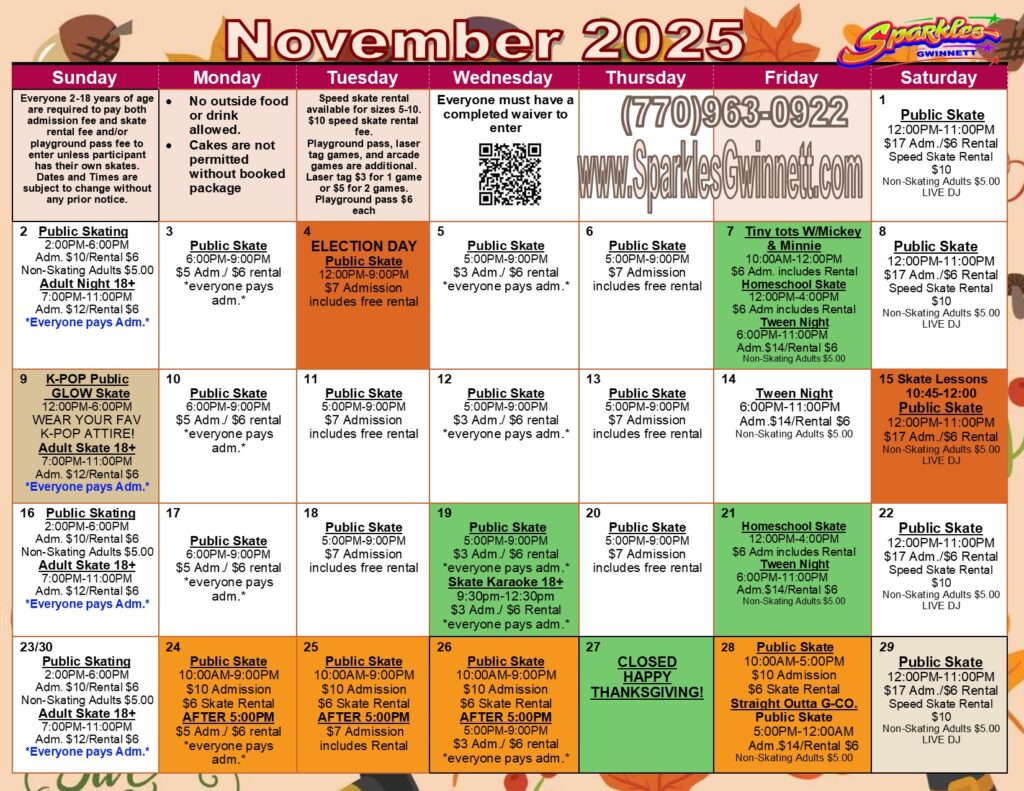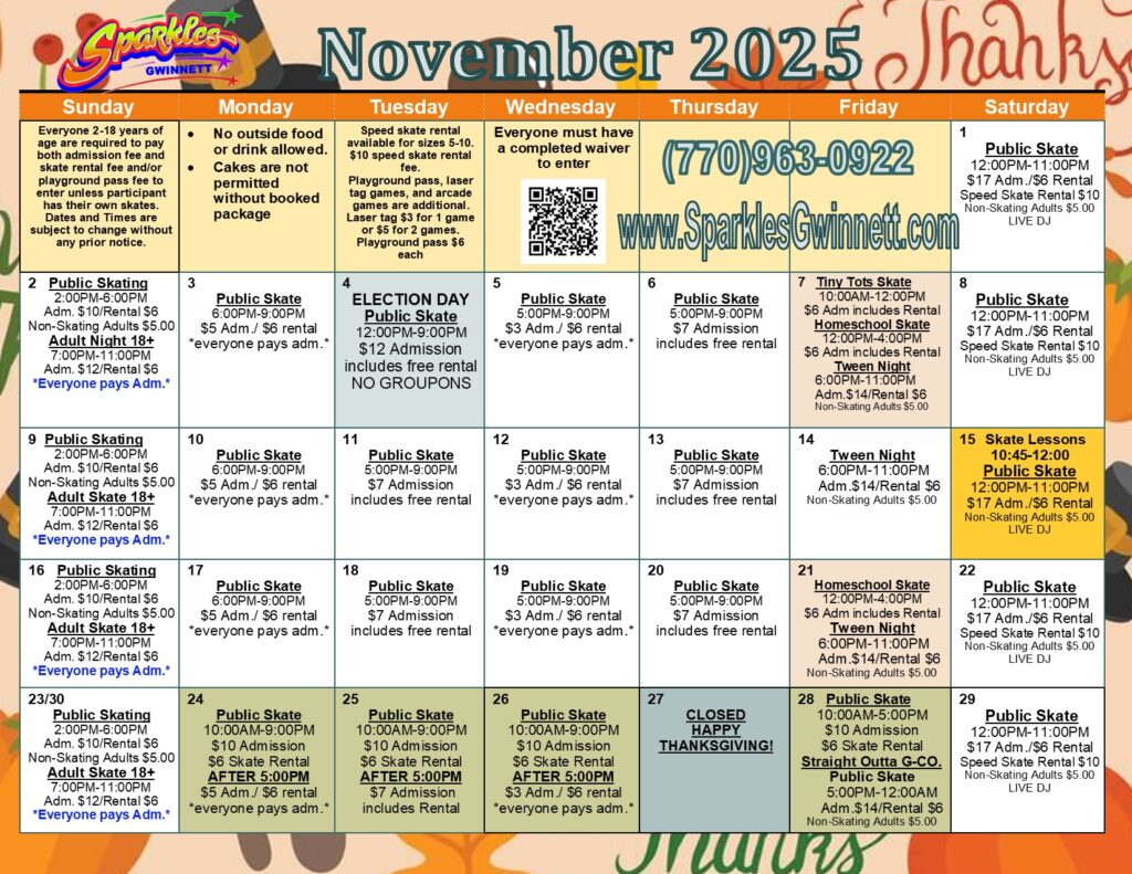 During all of our discount sessions, everyone must pay admission to enter the building, whether they are skating or not. All children ages 2-18 must always pay the session’s admission fee along with an activity fee to enter the facility. Playground is $6 and is for children 8 and younger only. Non-skating adults are $5 on Friday night, Saturday all day, and Sunday day.