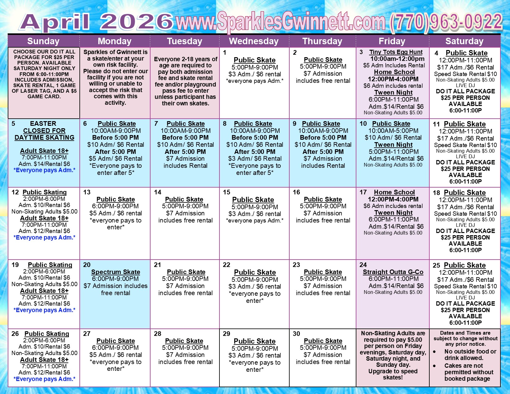 Skating times & prices are subject to change without prior notice. No outside food or beverage allowed. Cake is not permitted unless you have a reserved package.