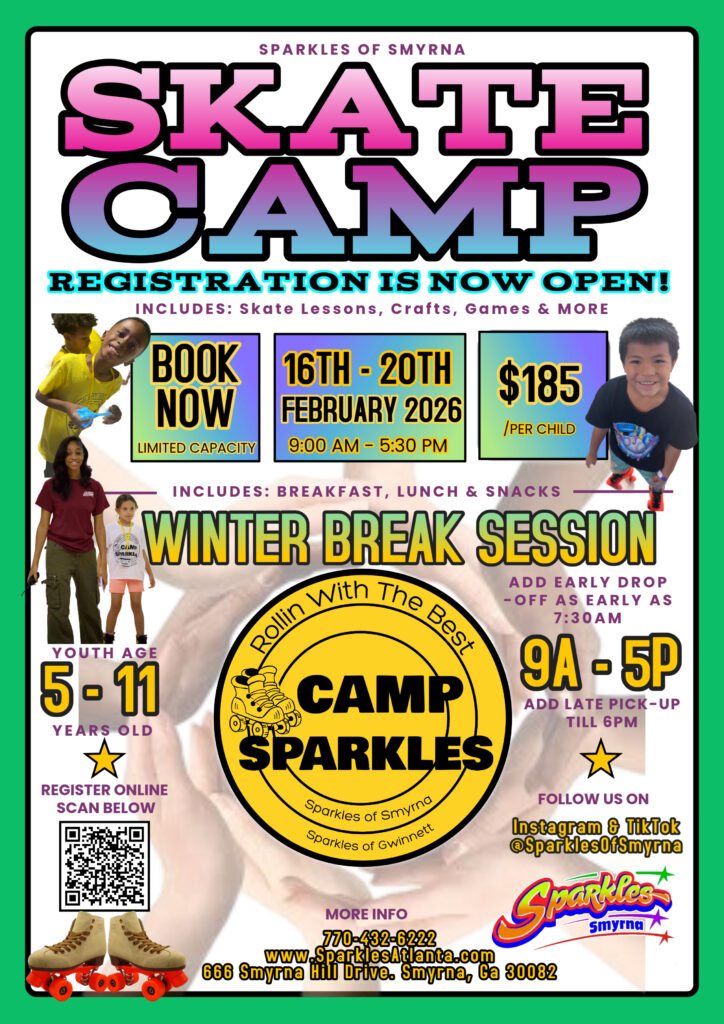 Camp Sparkles is a guaranteed fun time full of exercise and learning for your child! Our all-inclusive camp is perfect for ages 5-11 and includes a breakfast, lunch, and two snacks Your child will be fully supervised enjoying our awesome attractions and activities including skating, indoor playground, STEM/STEAM activities, games, crafts, basic skating lessons, and more!